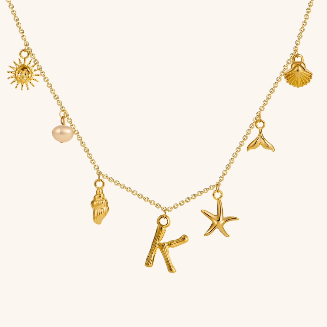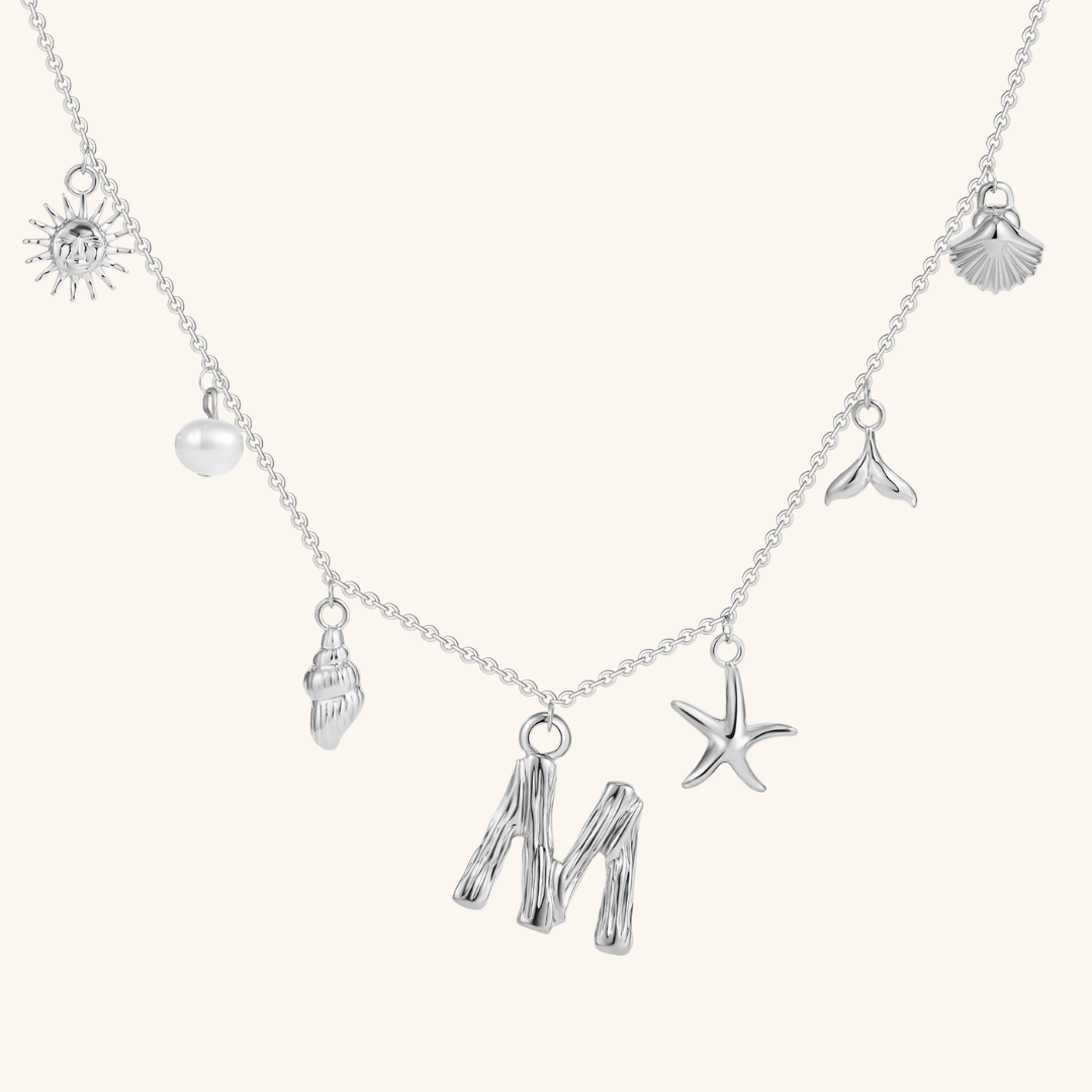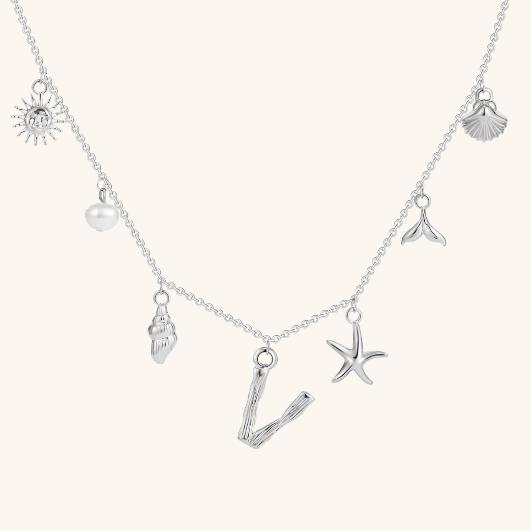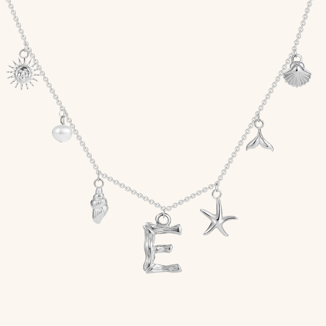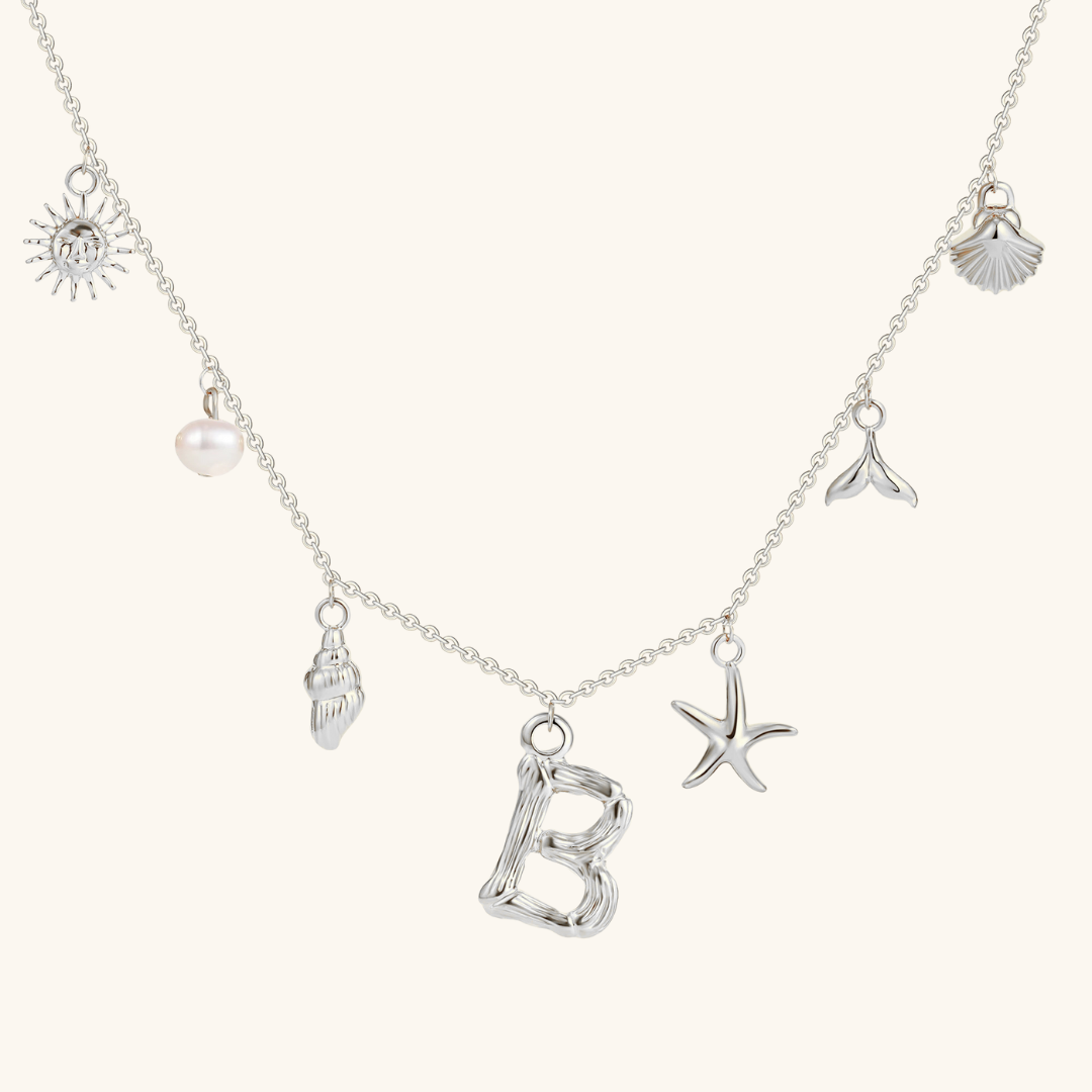Letters meet the sea. Avaria’s Ocean Initial Necklace combines your chosen initial with oceanic charms, from a starfish to a pearl drop. A piece that feels both personal and playful, it’s designed to keep meaning close in style.