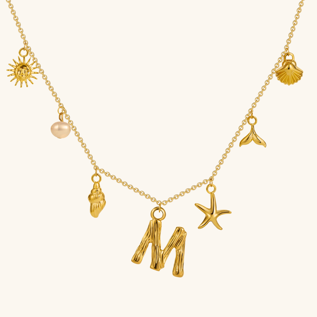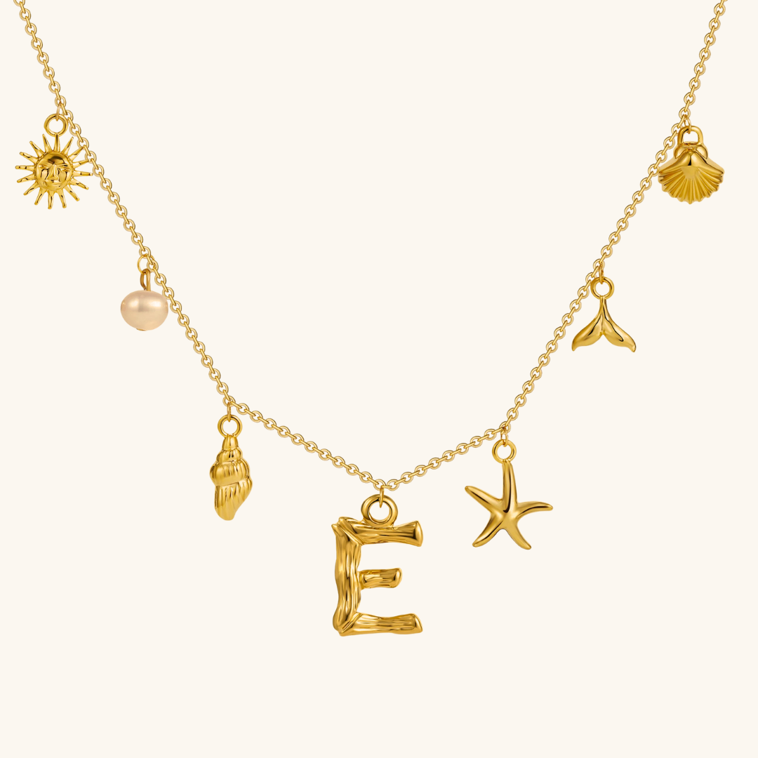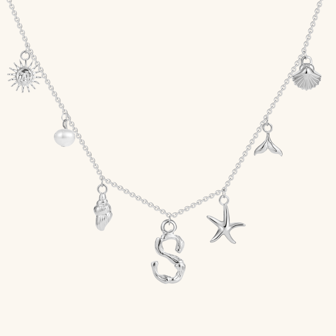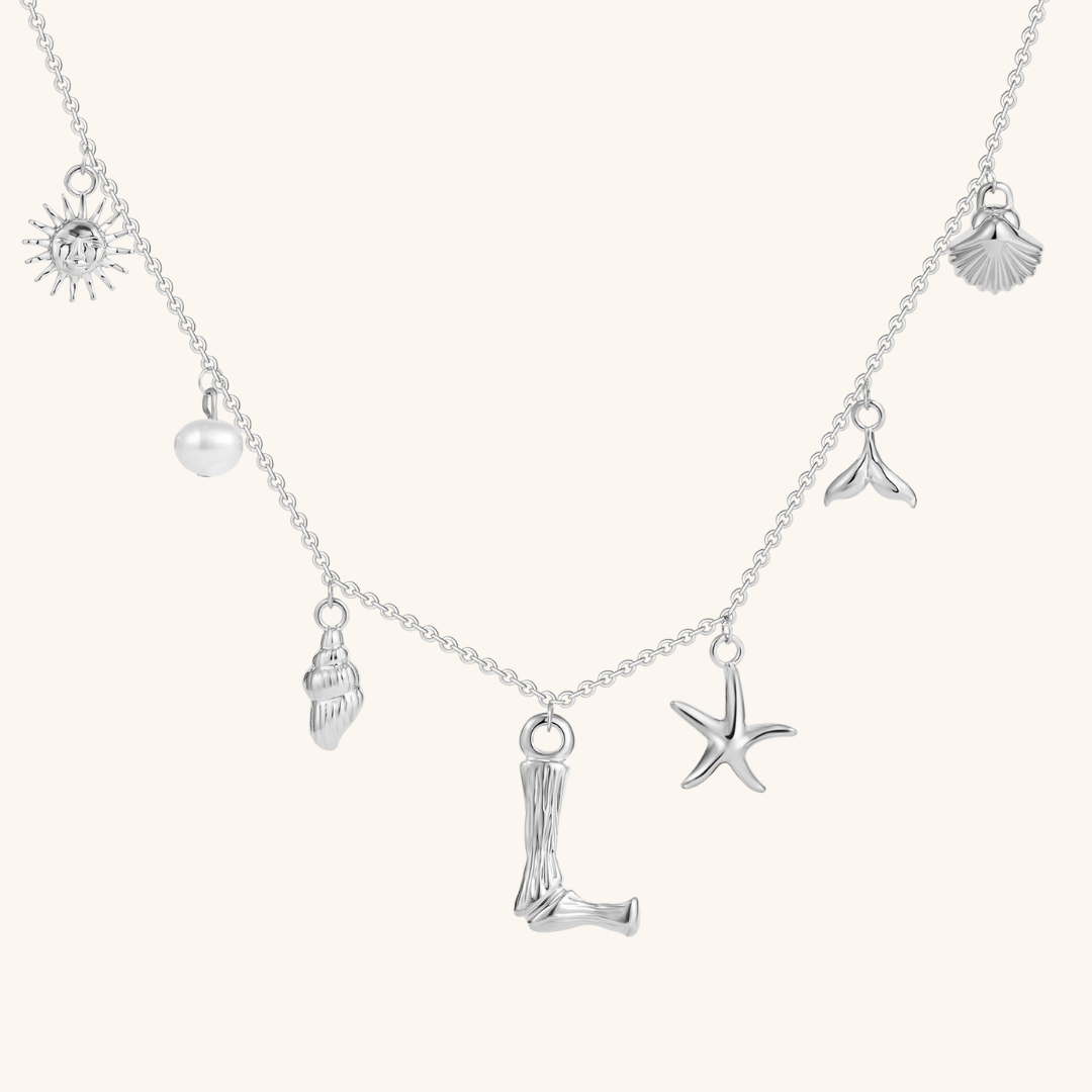 Letters meet the sea. Avaria’s Ocean Initial Necklace combines your chosen initial with oceanic charms, from a starfish to a pearl drop. A piece that feels both personal and playful, it’s designed to keep meaning close in style.