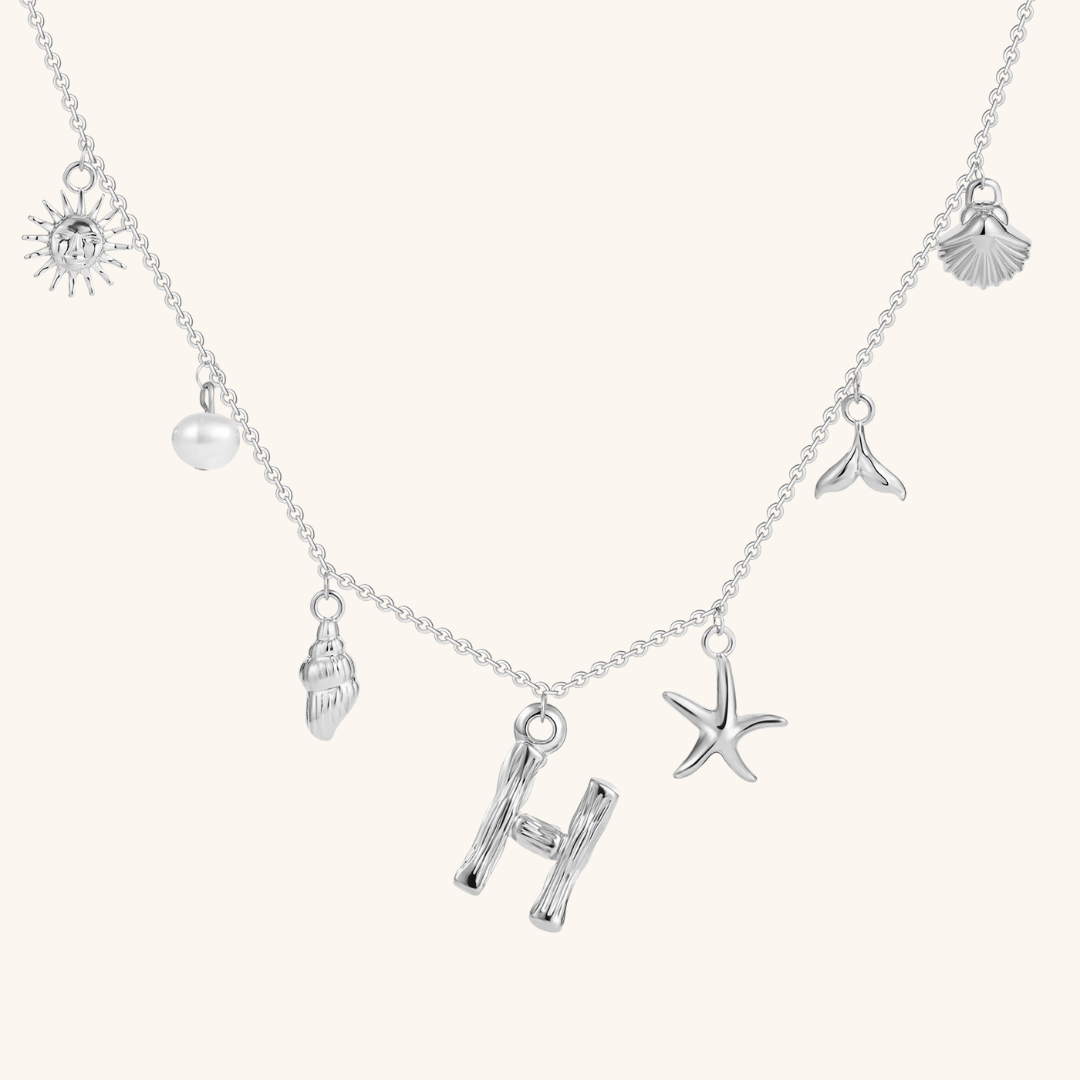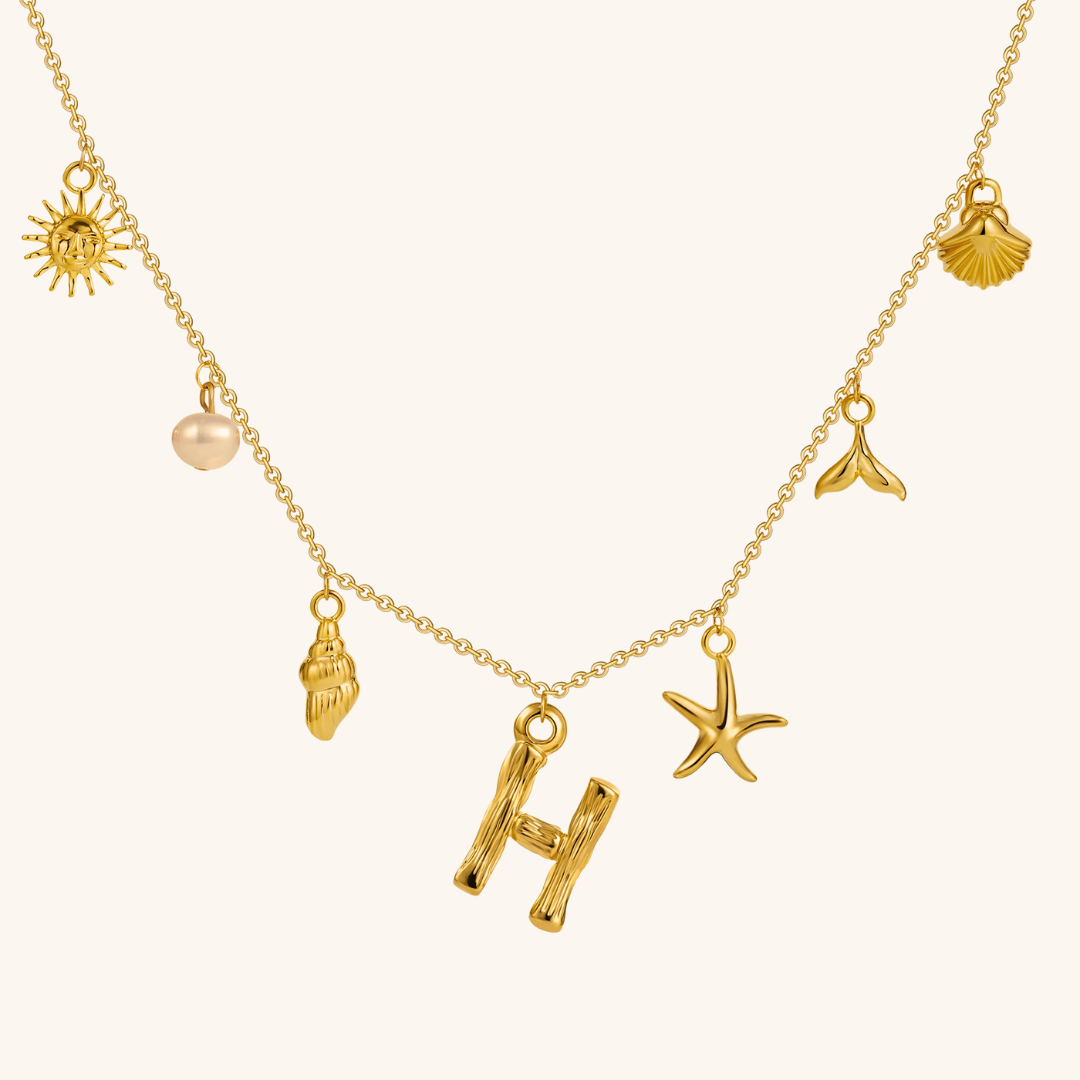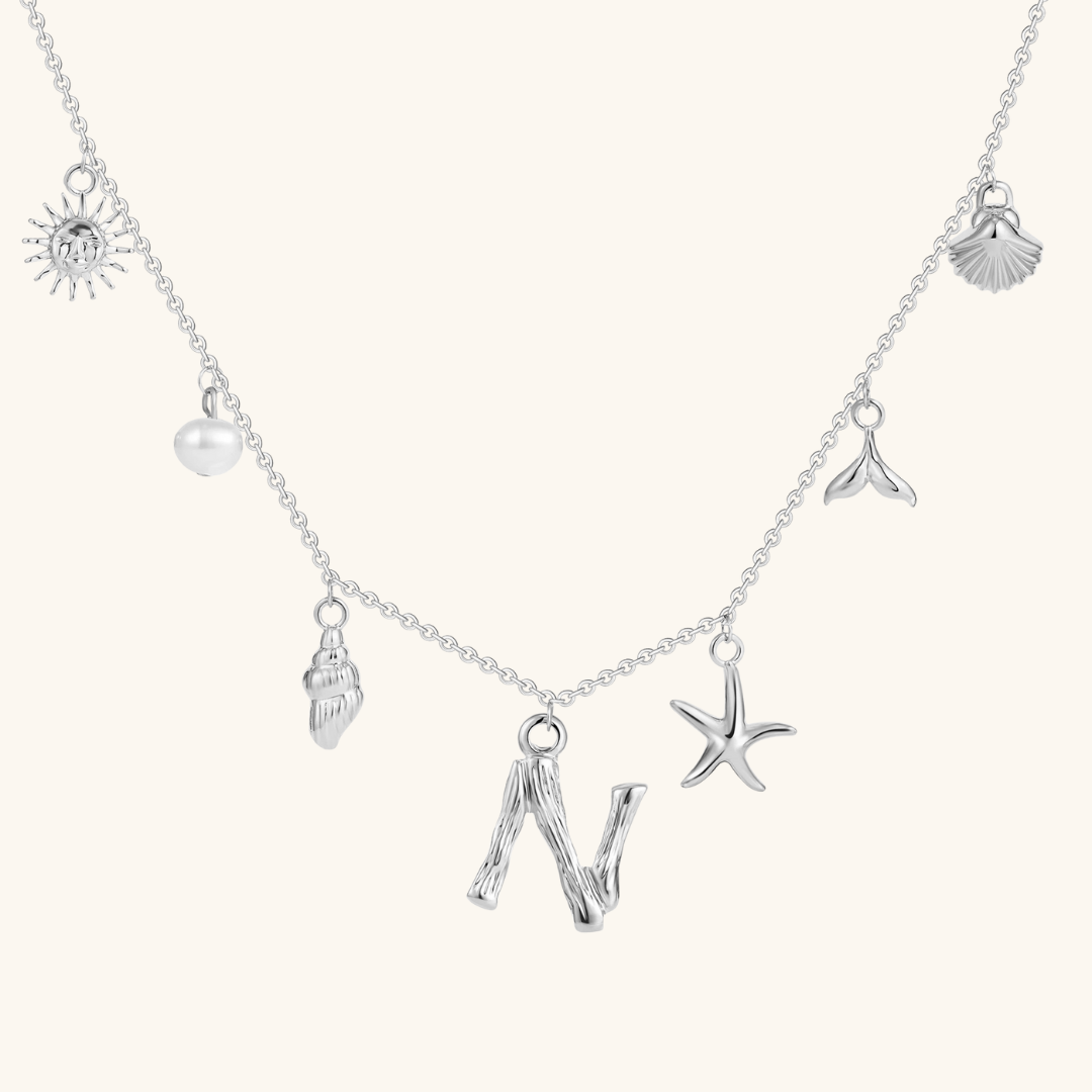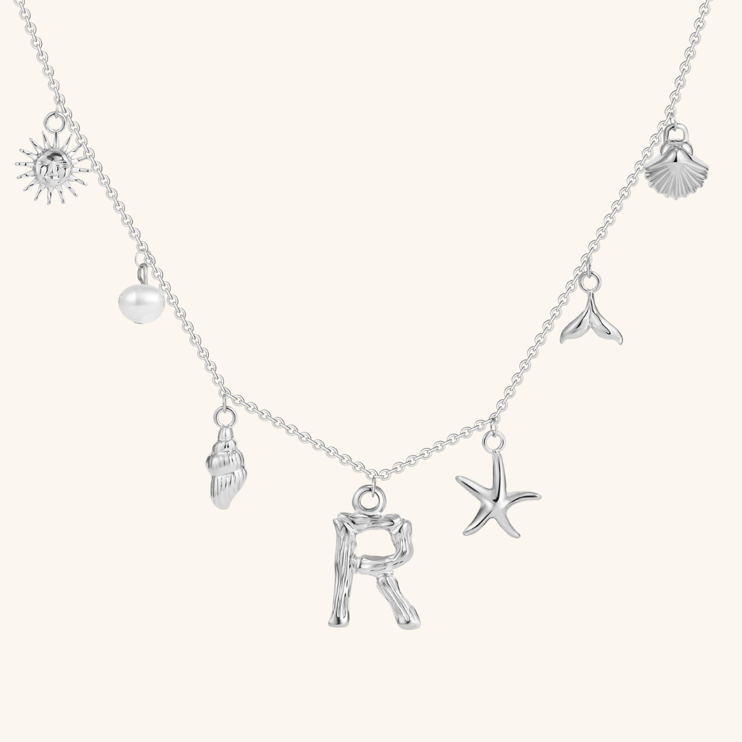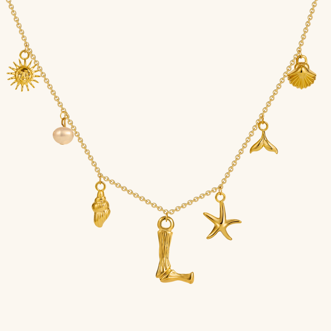 Letters meet the sea. Avaria’s Ocean Initial Necklace combines your chosen initial with oceanic charms, from a starfish to a pearl drop. A piece that feels both personal and playful, it’s designed to keep meaning close in style.