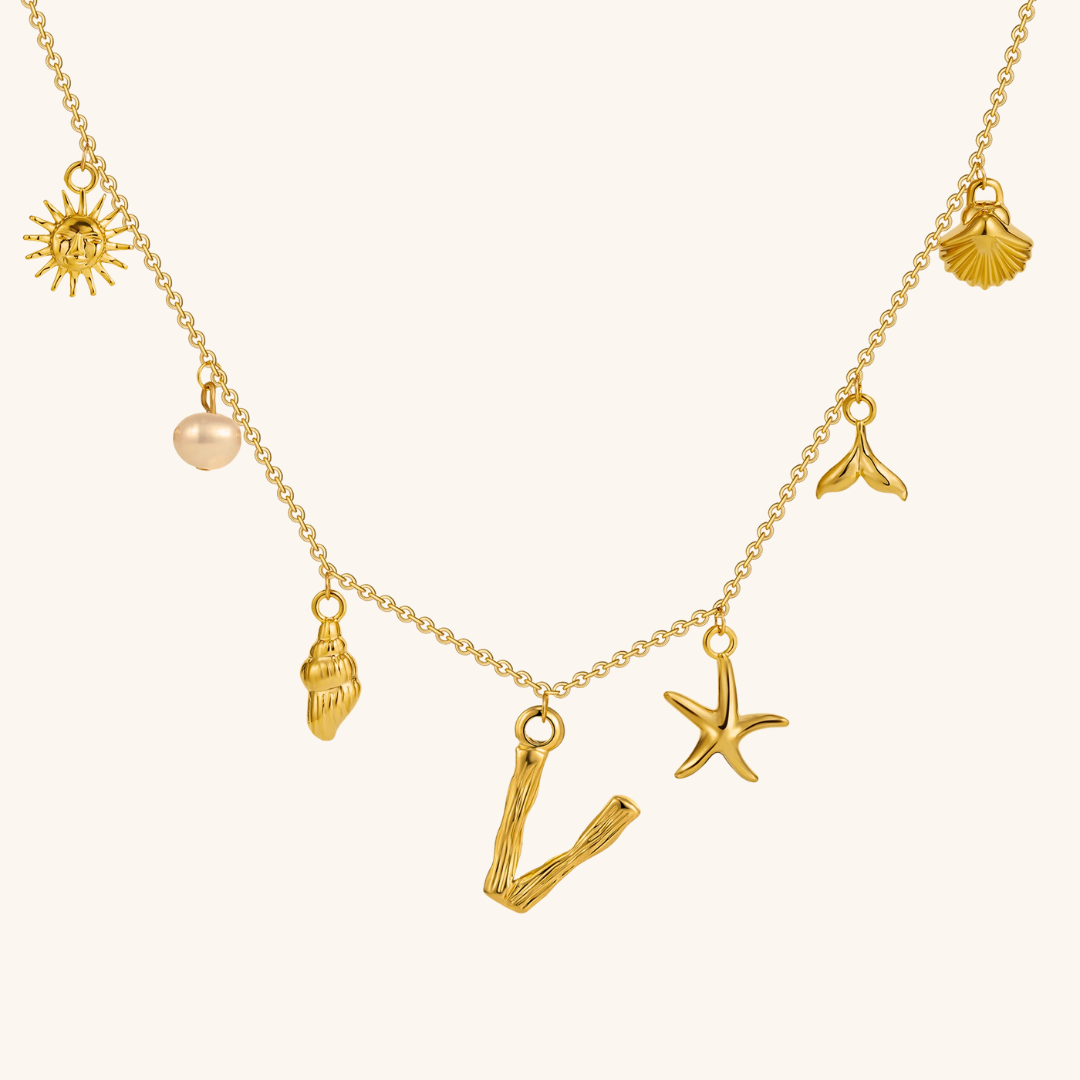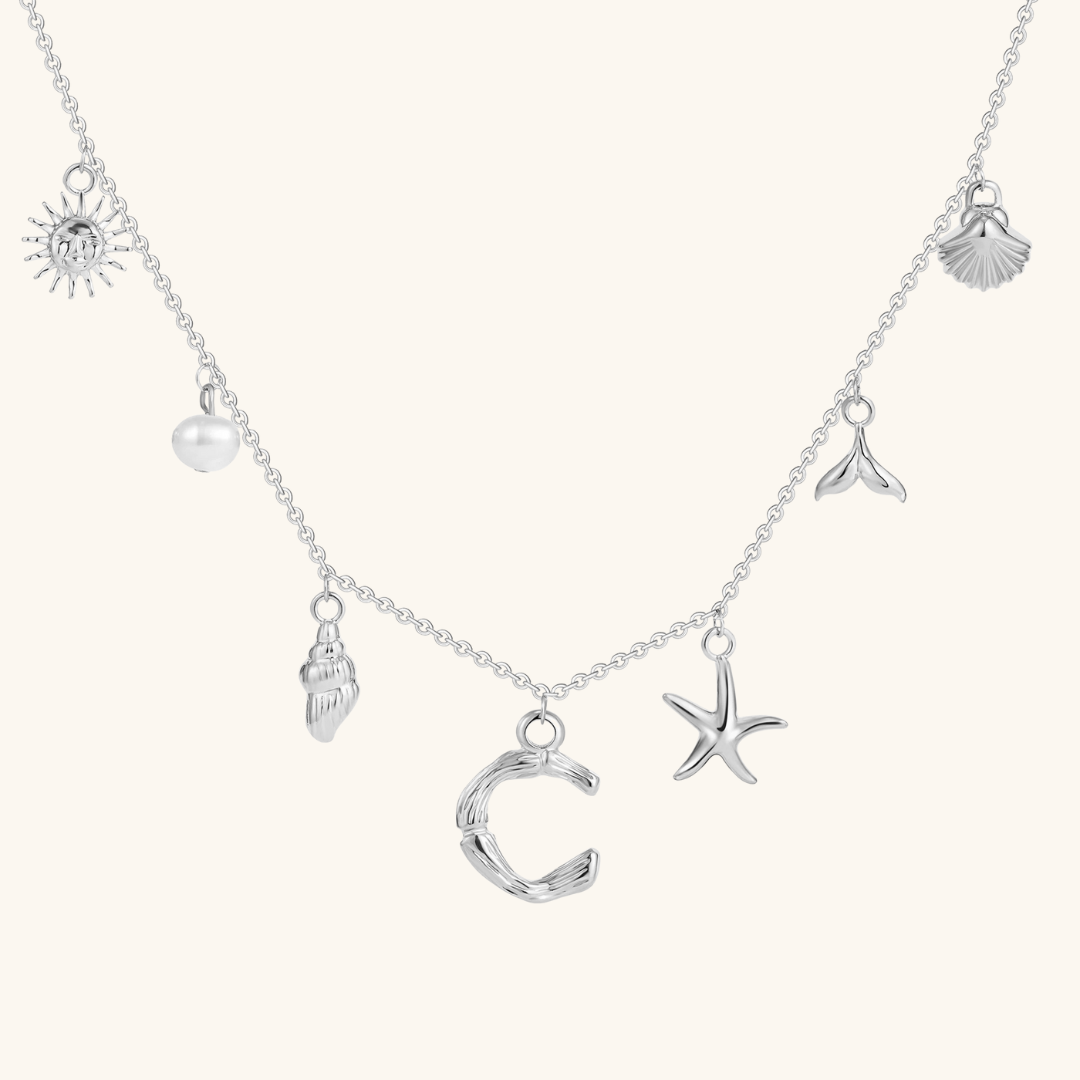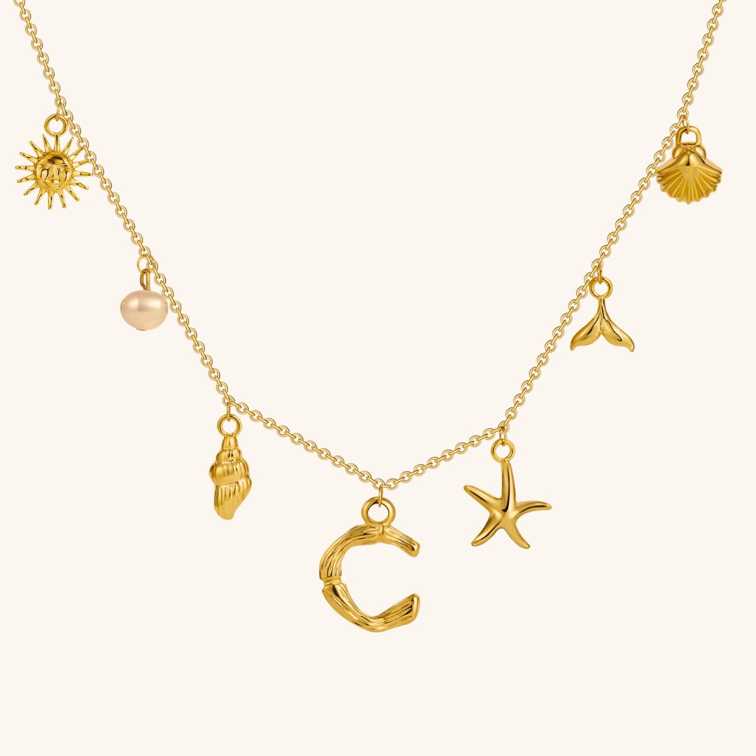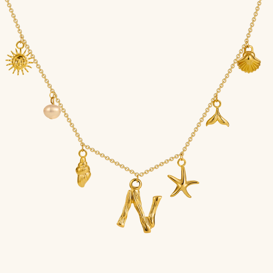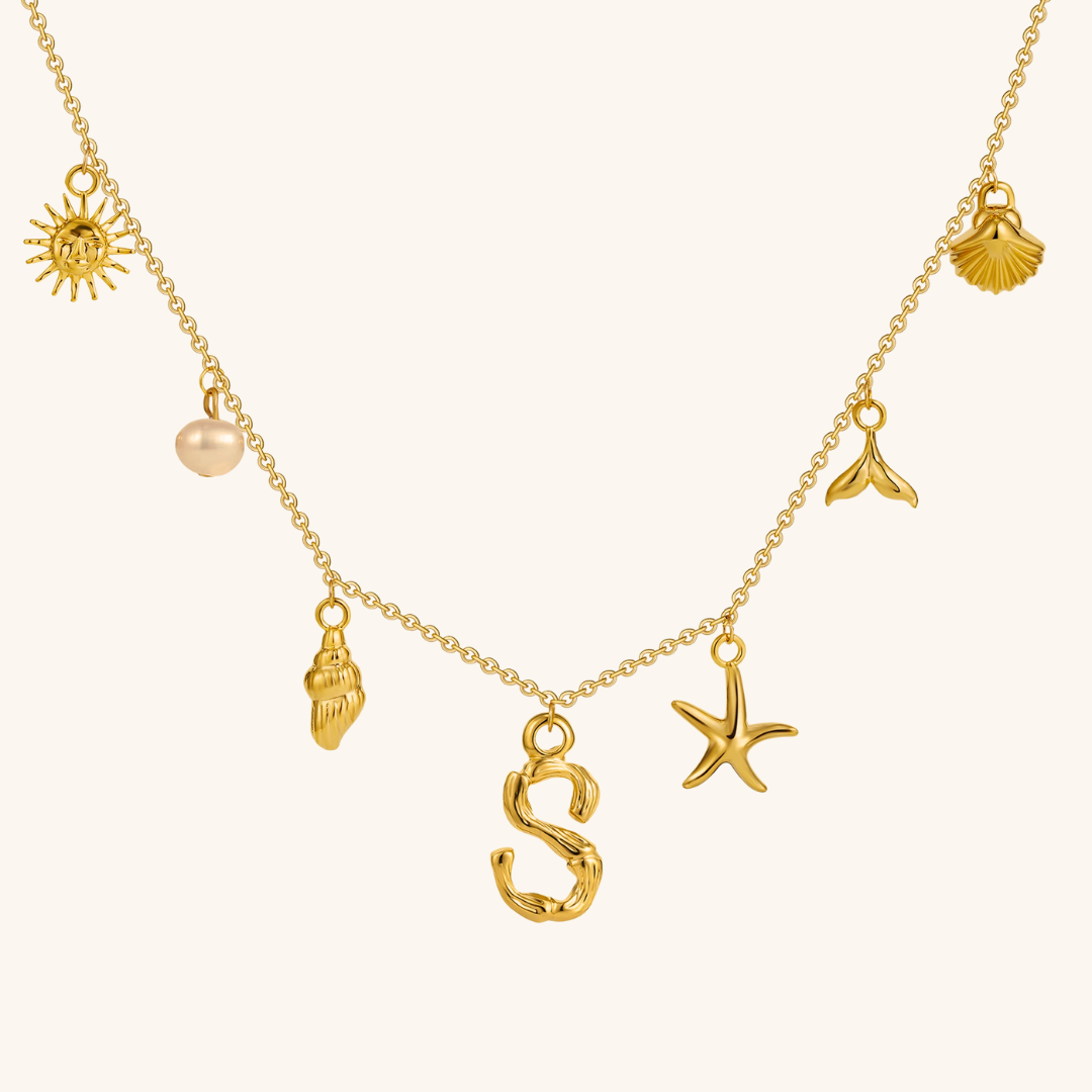 Letters meet the sea. Avaria’s Ocean Initial Necklace combines your chosen initial with oceanic charms, from a starfish to a pearl drop. A piece that feels both personal and playful, it’s designed to keep meaning close in style.