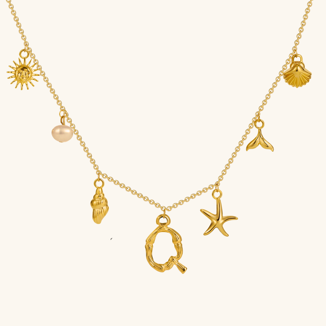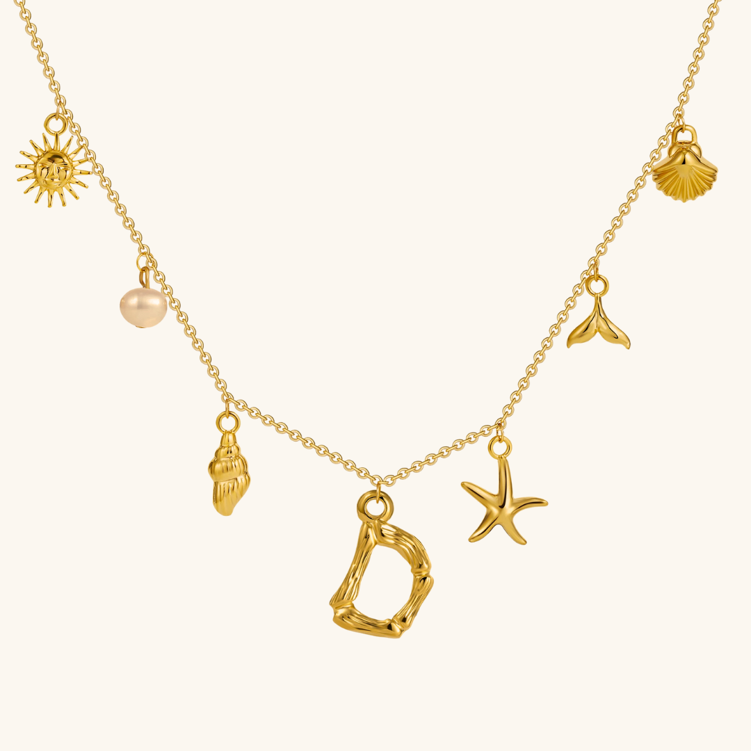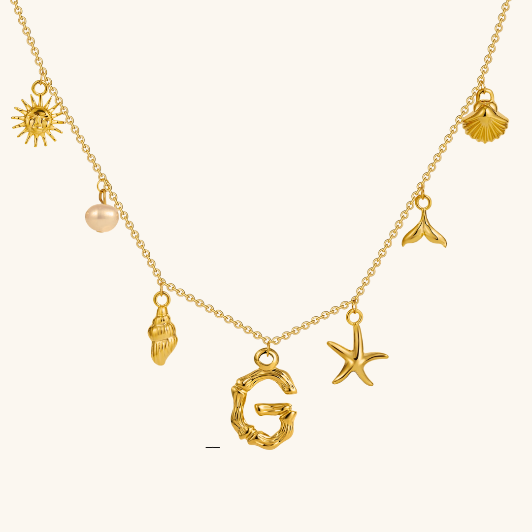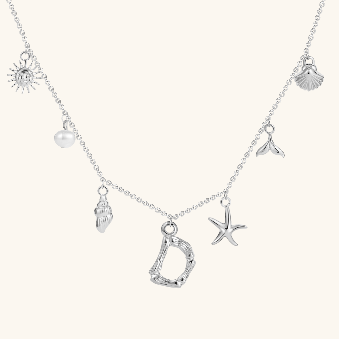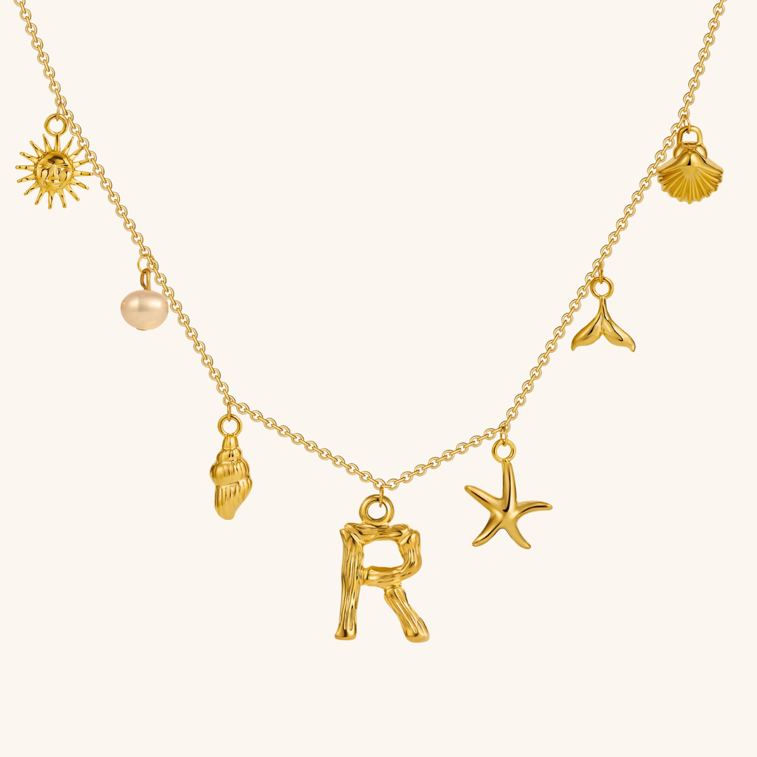 Letters meet the sea. Avaria’s Ocean Initial Necklace combines your chosen initial with oceanic charms, from a starfish to a pearl drop. A piece that feels both personal and playful, it’s designed to keep meaning close in style.