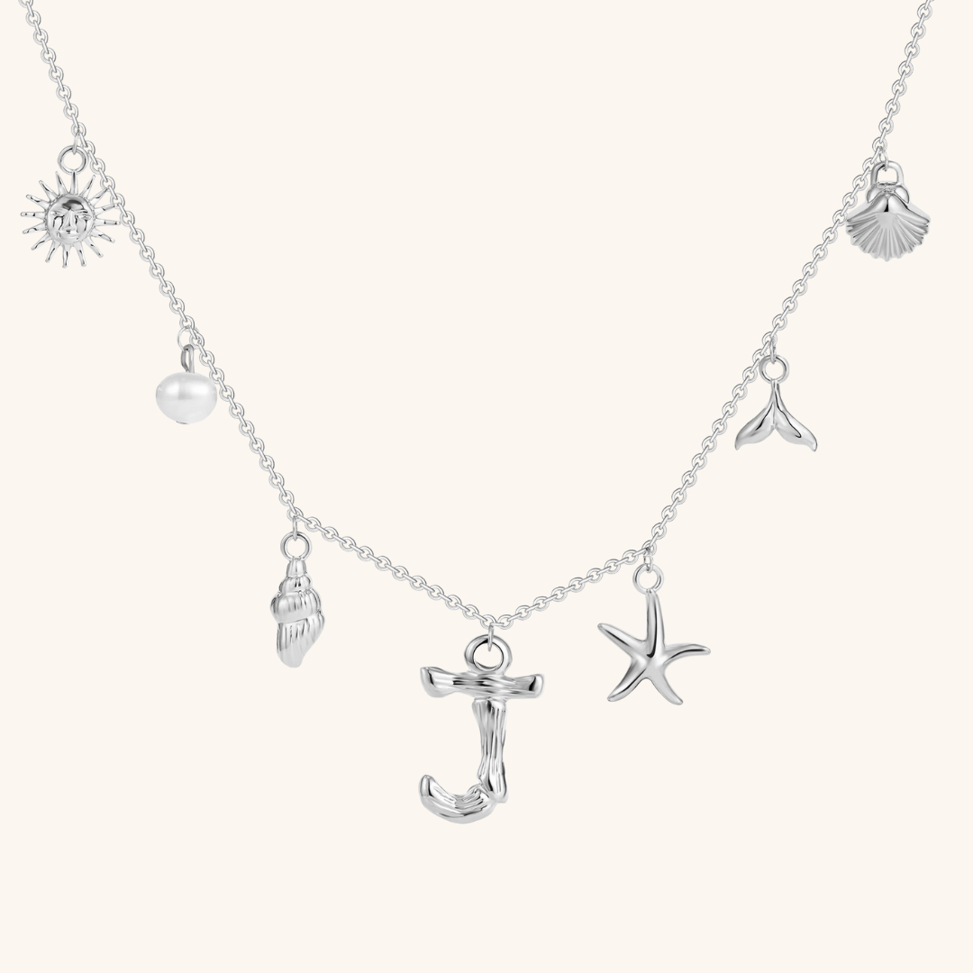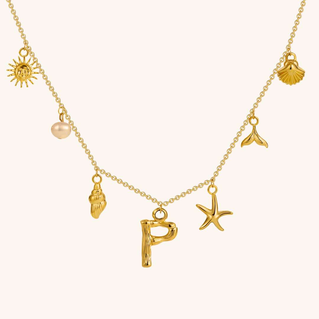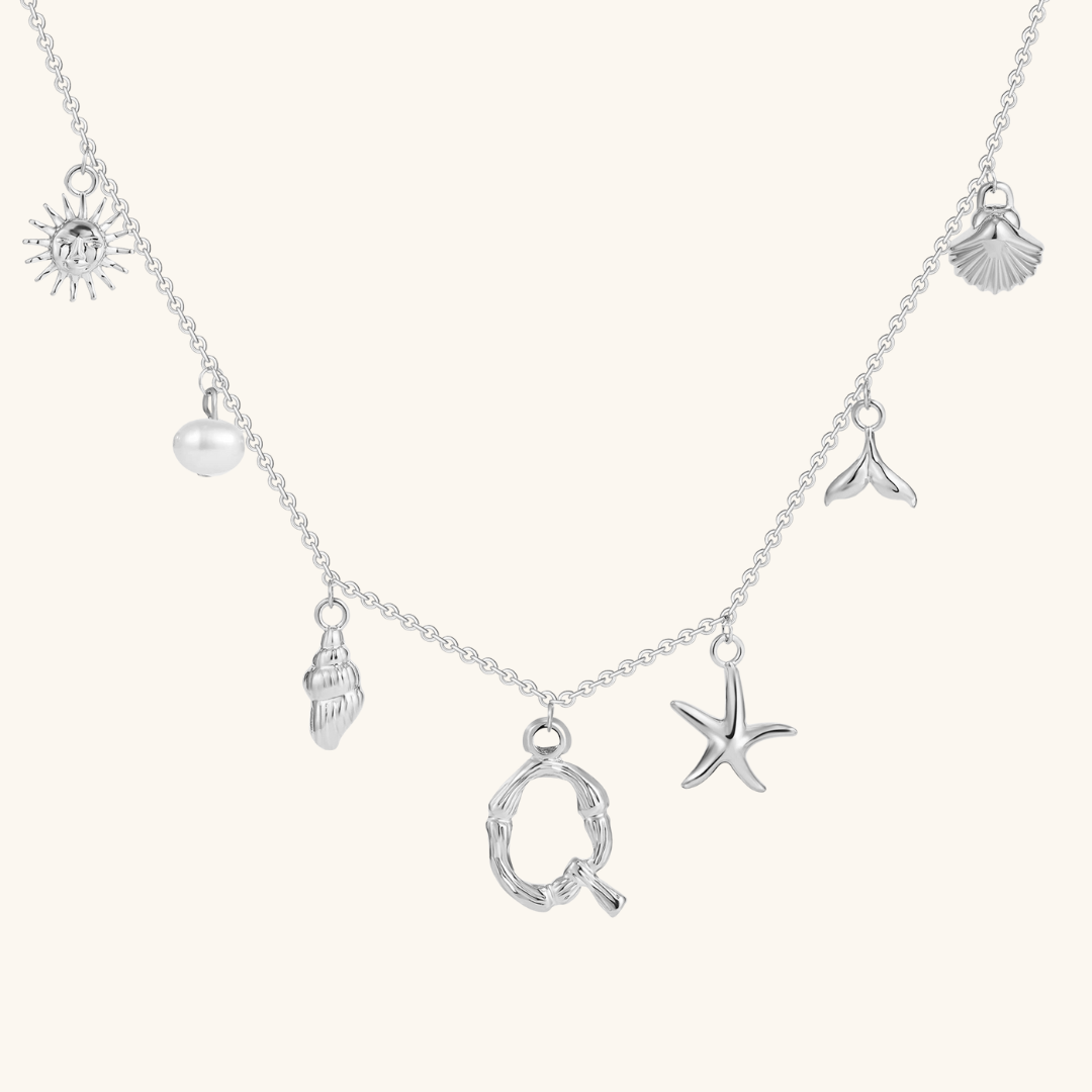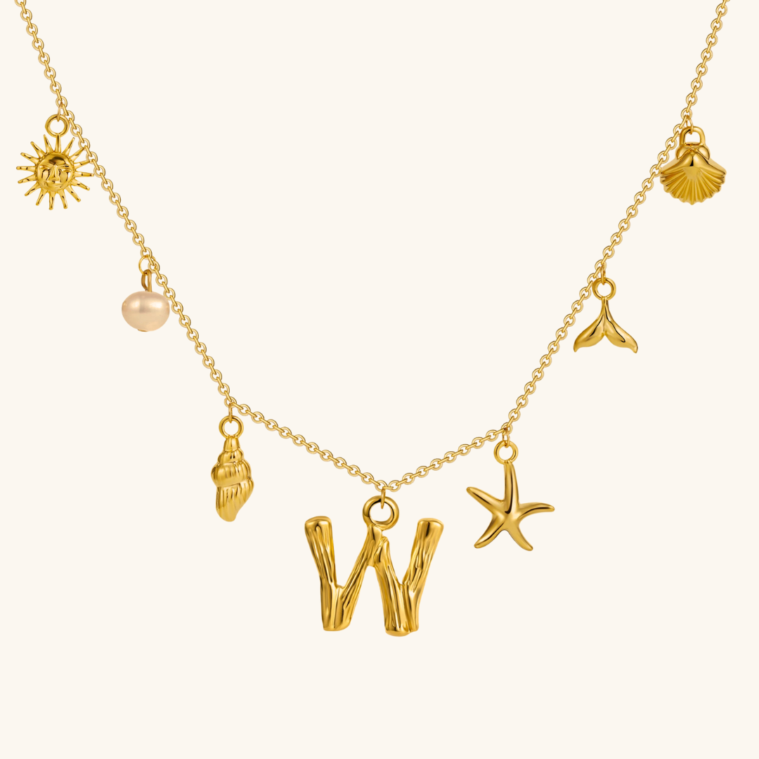 Letters meet the sea. Avaria’s Ocean Initial Necklace combines your chosen initial with oceanic charms, from a starfish to a pearl drop. A piece that feels both personal and playful, it’s designed to keep meaning close in style.