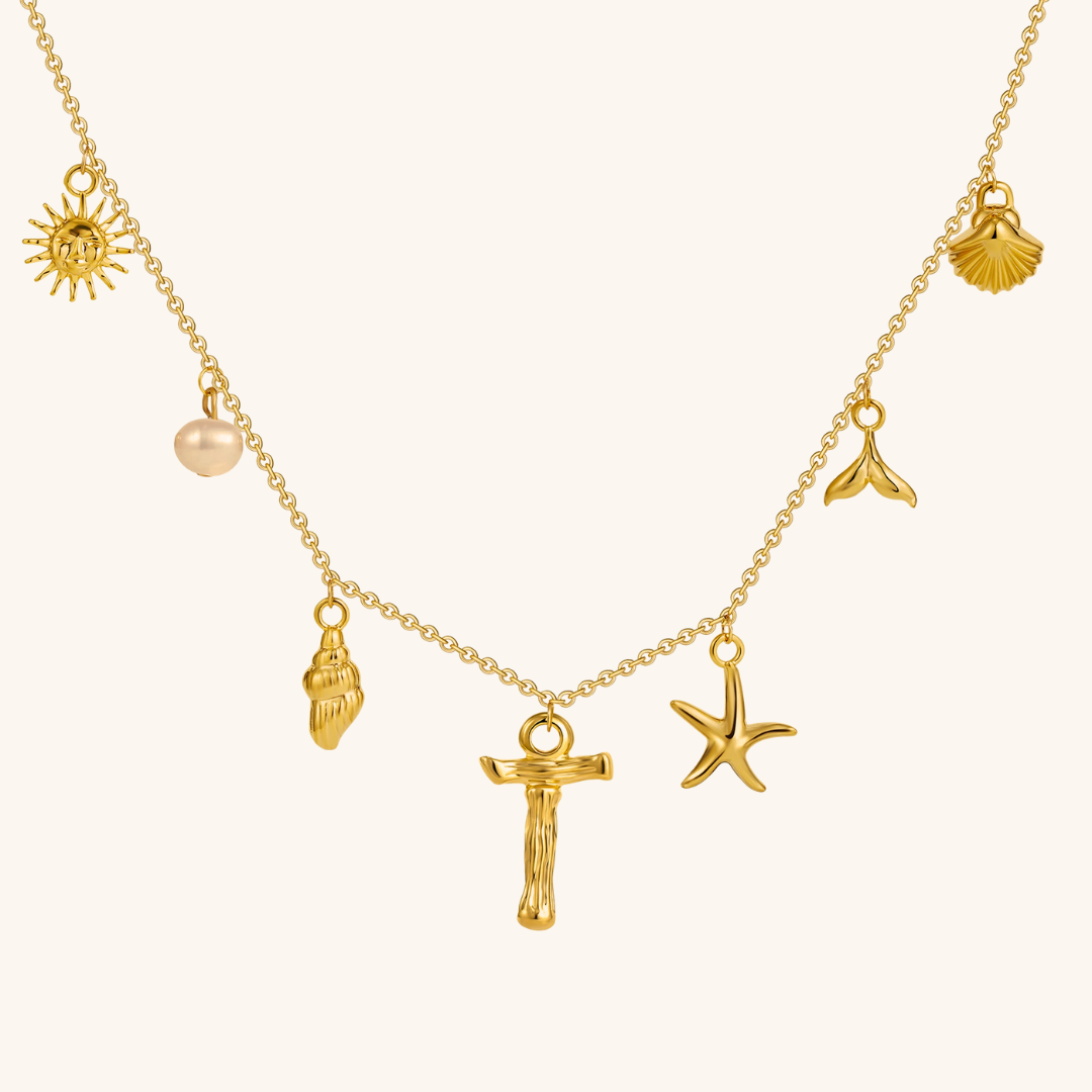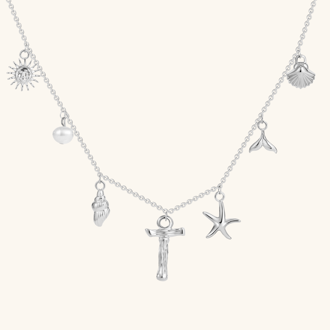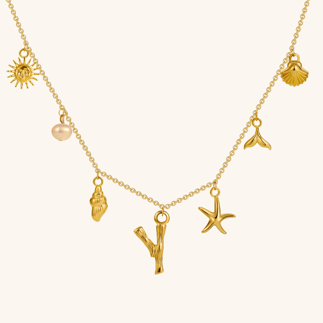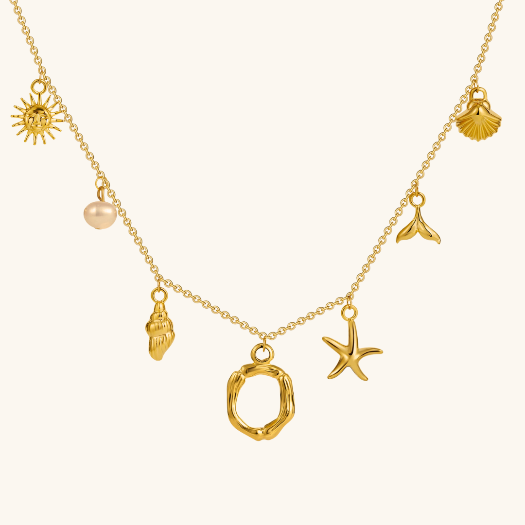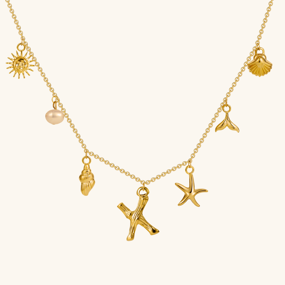 Letters meet the sea. Avaria’s Ocean Initial Necklace combines your chosen initial with oceanic charms, from a starfish to a pearl drop. A piece that feels both personal and playful, it’s designed to keep meaning close in style.