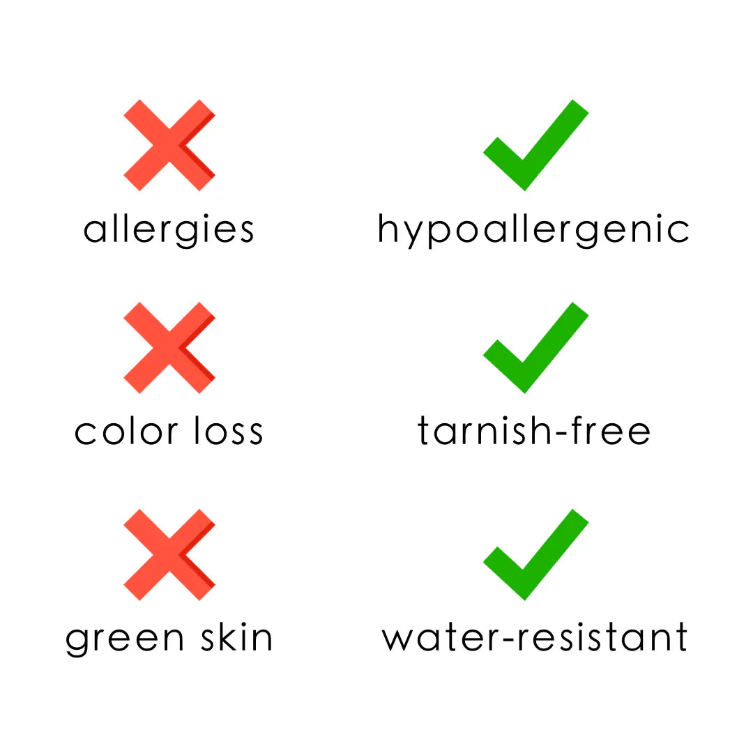 - Water, Sweat, and Heat Resistant. (No discoloration, No Tarnishing).